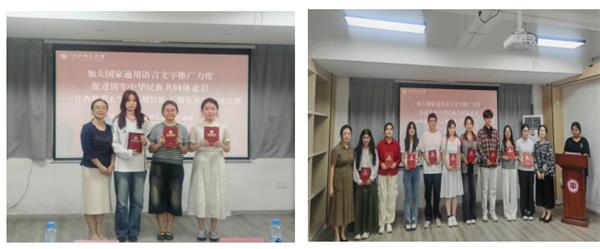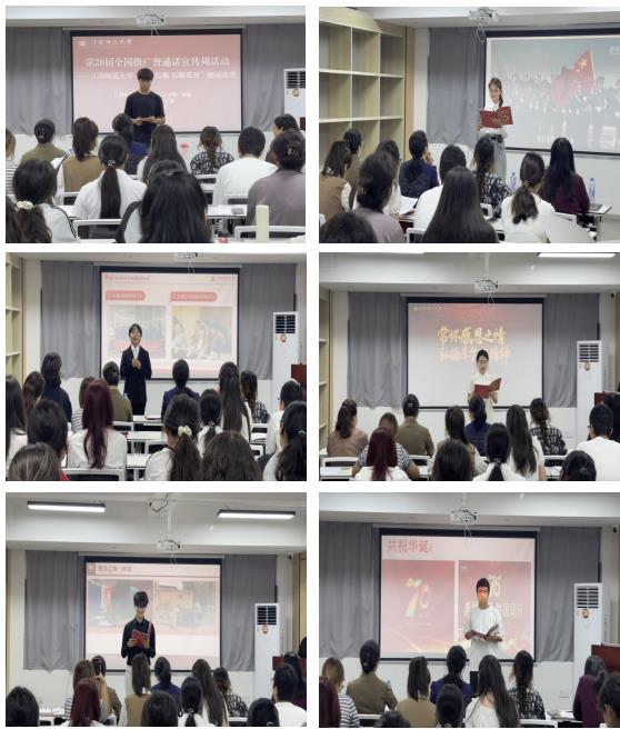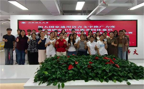 在第28届全国推广普通话宣传周期间,为深入贯彻落实习近平总书记关于铸牢中华民族共同体意识的重要论述,9月24日下午,国家语言文字推广基地(江西师范大学)联合学生处,在学校一站式学生社区红色讲堂成功举办“石榴信箱 石榴花开”朗诵比赛。活动旨在通过朗诵艺术推广国家通用语言文字,深化民族团结进步教育,增强各民族学生的交流与认同。教务处学生学习指导中心主任金绍梅、党委学工部(学生处)副部长袁蓉、江西省普通话水平测试员匡蓉蓉担任评委。