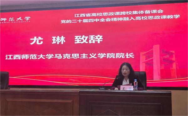 为深入学习贯彻党的二十届四中全会精神,扎实推进会议精神高质量融入高校思政课教学,11月3日上午,由江西师范大学马克思主义学院主办的“党的二十届四中全会精神融入高校思政课教学”省级集体备课会成功举办。教育部“长江学者”特聘教授、武汉大学主流意识形态研究院院长、弘毅特聘教授项久雨出席并做专题报告,来自全省近100名思政课教师参加。马克思主义学院院长尤琳出席备课会并致辞,会议由马克思主义学院副院长黄徐强主持。