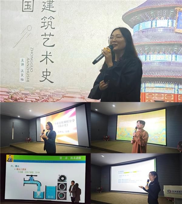 在随后进行的“十佳百优”公开课环节,学院近三届五位获奖教师依次登台,呈现了各具特色的教学展示。汪笑楠老师以“行在当下”为题,解读了王澍等当代建筑师如何将传统园林智慧融入现代建筑实践,从场地、空间与材料三个层面,呈现中国建筑“与自然共生”的当代路径;方袆老师从古希腊多立克、爱奥尼亚与科林斯三种经典柱式入手,结合雅典卫城、帕提农神庙等实例,生动阐释了古希腊建筑中的人文精神与美学逻辑;刘俊杰老师围绕《数码摄影技艺》课程,系统讲解曝光三要素、测光模式与曝光补偿技术,并借助“白加黑减”“暗加亮减”等实用原则,帮助学生掌握精准调控画面光影的关键技能;周敏老师以央视春晚节目《只此青绿》为引,深入剖析王希孟《千里江山图》所蕴含的三重境界——自然山水、精神山水与政治山水,引导学生从艺术史、文化认同与时代精神等多重视角理解传统绘画的深厚内涵;唐阿君老师则聚焦色彩三要素——色相、明度与纯度,结合丰富案例,深入浅出地解析了色彩调和的原理与实际应用,助力学生构建系统的色彩认知与表达能力。