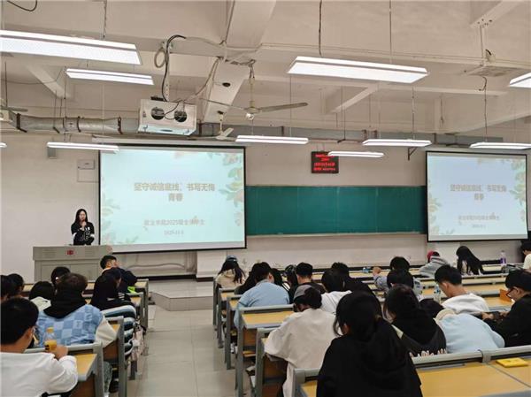 为强化学生诚信意识,营造公平公正的考试氛围,11月1日,政法学院在惟义楼7102开展“坚守诚信底线,书写无悔青春”诚信考试主题教育活动,2025级全体新生300余人参加。