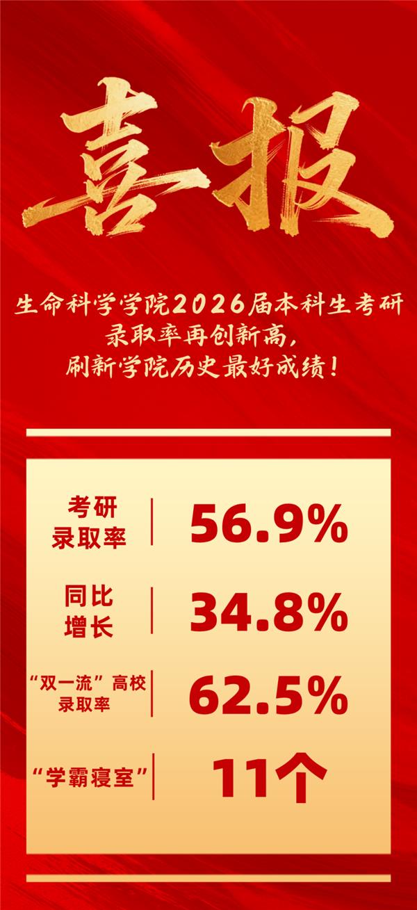 生命科学学院始终高度重视学风建设,将考研升学作为凝练优良学风、助力学生成长的重要抓手,持续营造勤学共进、笃志求索的浓厚学习氛围。在2026届考研中,我院281名毕业生,160人成功录取,考研录取率达56.9%,同比增长34.8%,比上年提高14.7个百分点,再度刷新学院历史新高;其中,被“双一流”高校录取学生比例为62.5%,升学质量持续攀升;全院涌现出11个全员上岸“学霸寝室”,生动诠释了同心逐梦、并肩前行的青春风采。