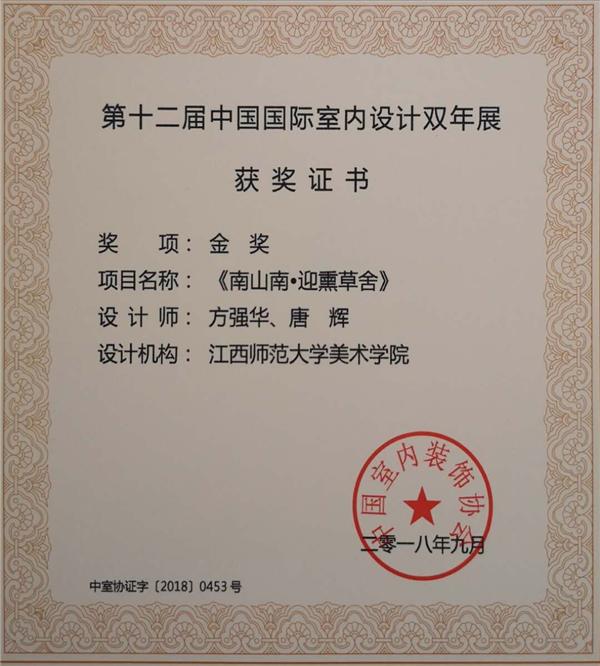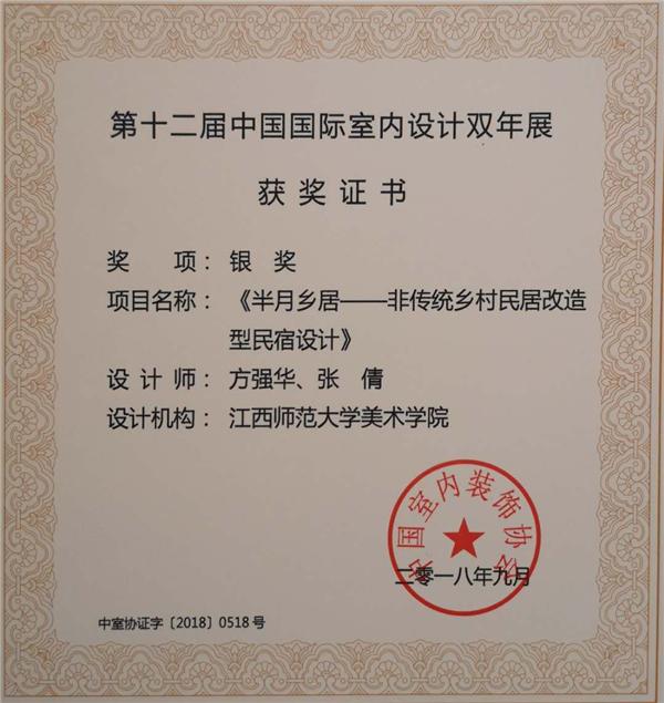 近日,从刚刚落幕的“2018中国室内设计周暨上海国际室内设计节”上传来喜讯,在“第十二届中国国际室内设计双年展”上,我校美术学院环境设计系教师方强华带领本专业学生唐辉、张倩,共同创作的设计作品《南山南•迎熏草舍》、《半月乡居——非传统乡村民居改造型民宿设计》分别获得金奖及银奖。