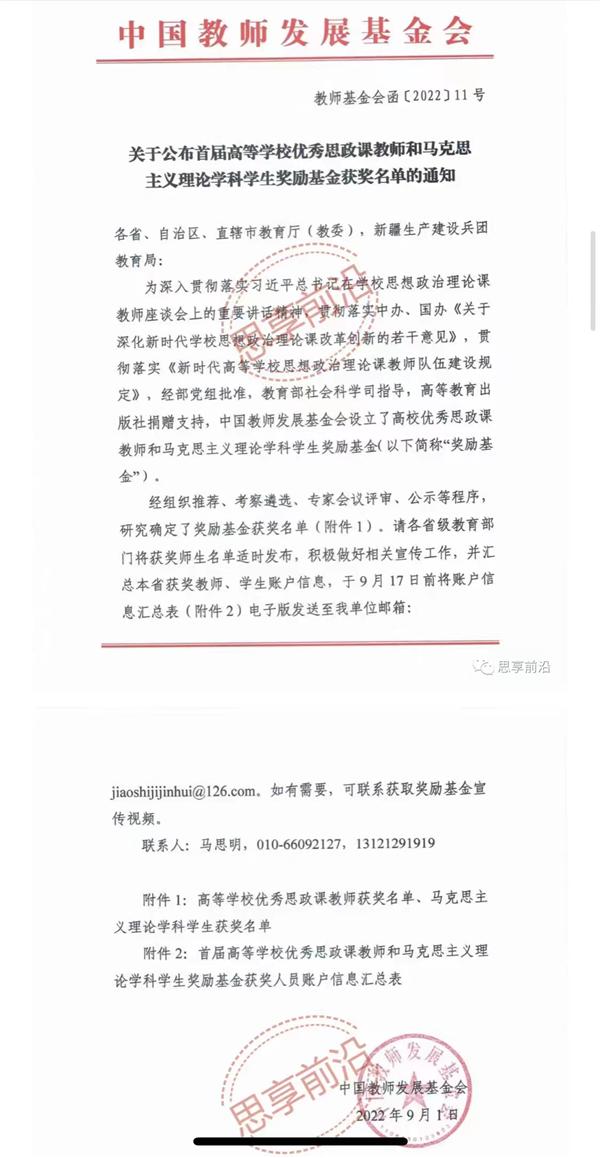 近日,中国教师发展基金会正式公布《首届高等学校优秀思政课教师和马克思主义理论学科学生奖励基金获奖名单》(教师基金会函【2022】11号)。
